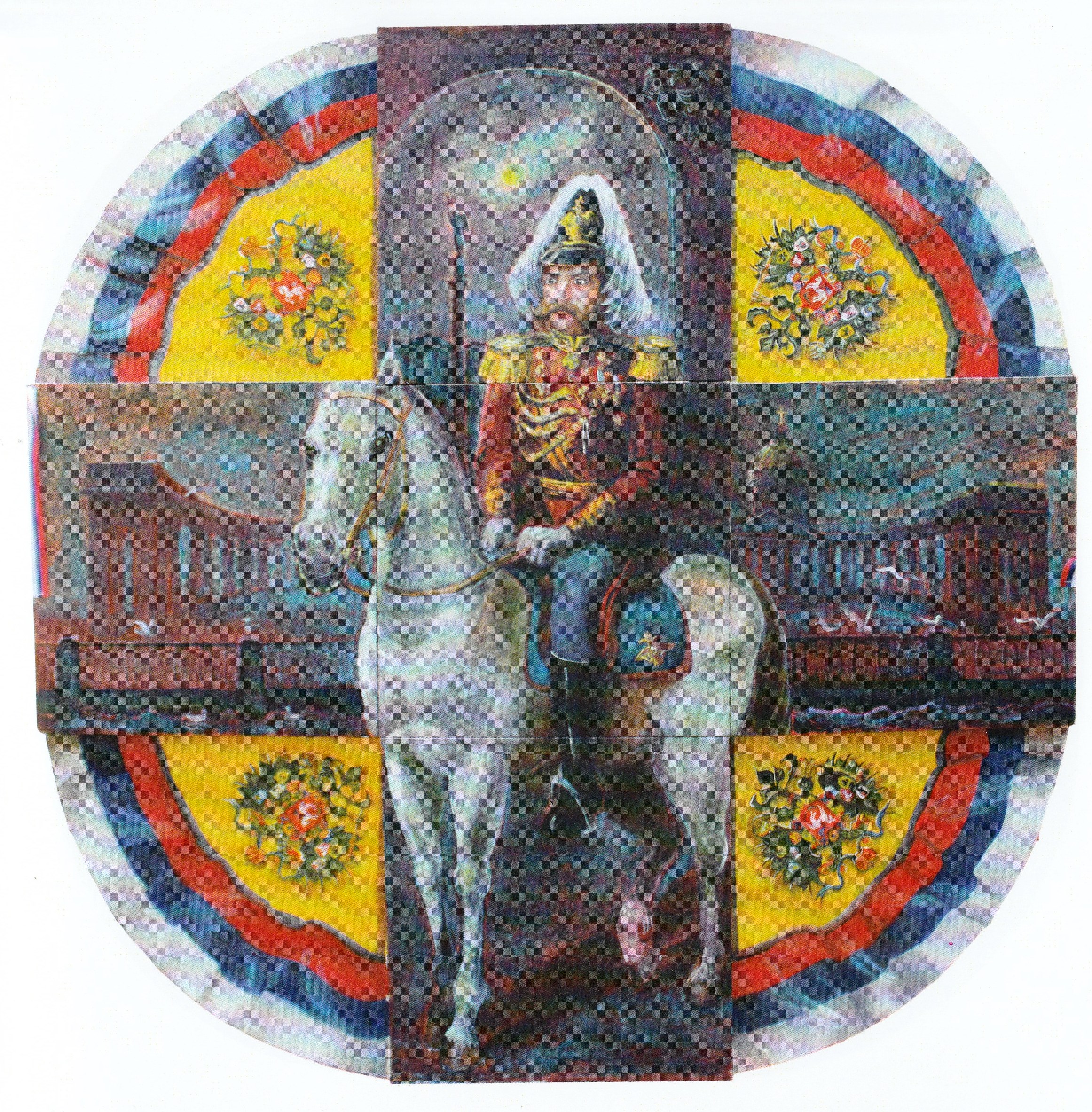 Наталья Агаркова: «В 2009 году мы с Марком получили заказ на конный портрет одного выдающегося деятеля, и в то же время к нам обратился «Красный крест». В ожидании выставки в Союзе художников мы сидели и рисовали эскизы композиции, и вдруг деятель на коне неожиданно хорошо вписался в крест! Невероятная композиция получила одобрение тогдашнего председателя Союза художников, и так структурно родился новый цикл».